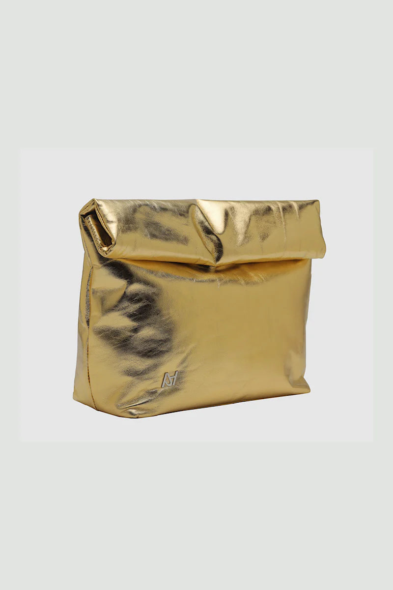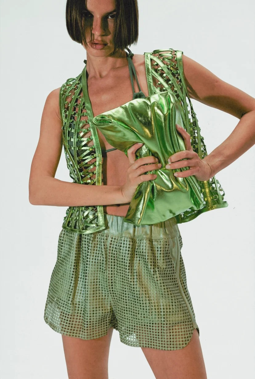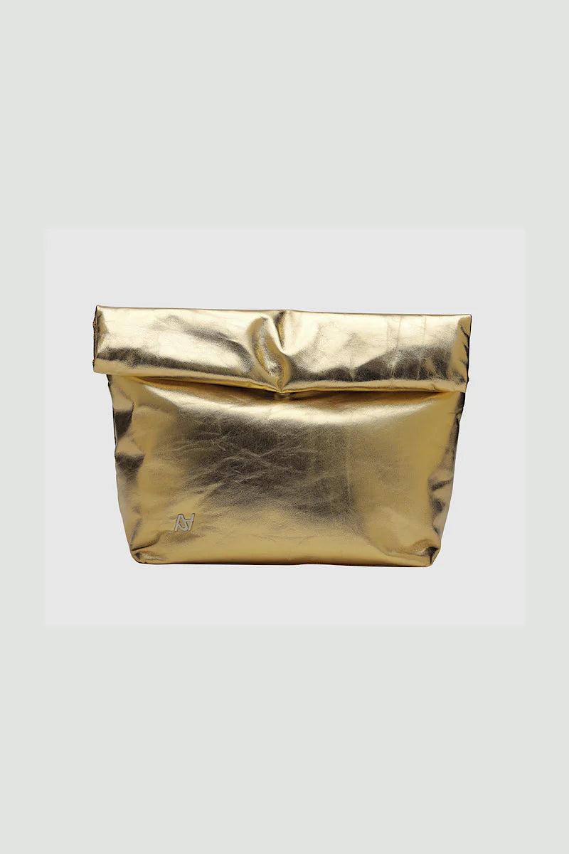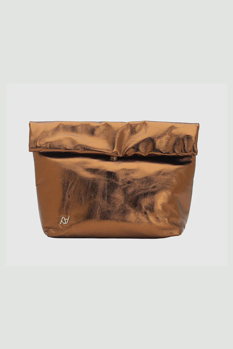 Metallic leather clutch with inside pockets and snap button closure. Available in washed silver, electric green, gold and copper.