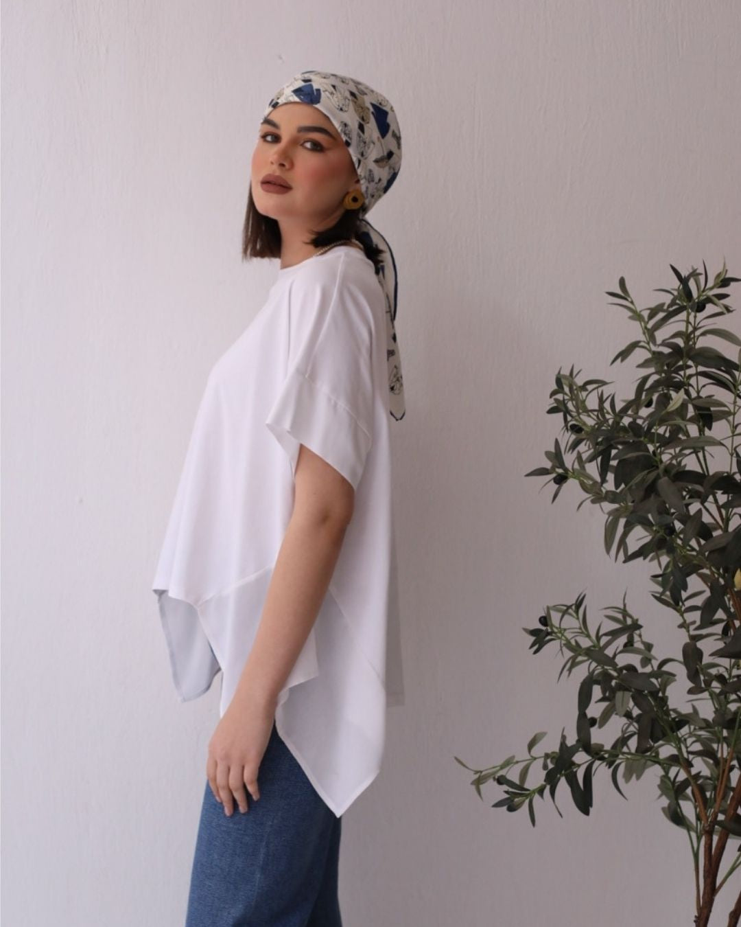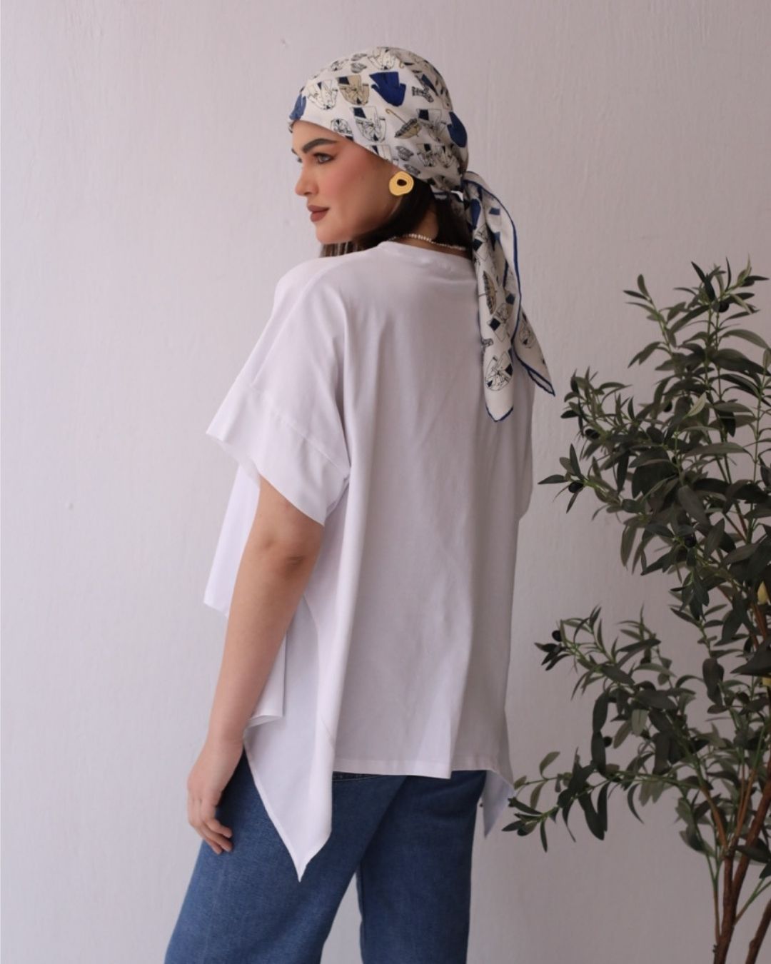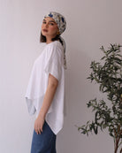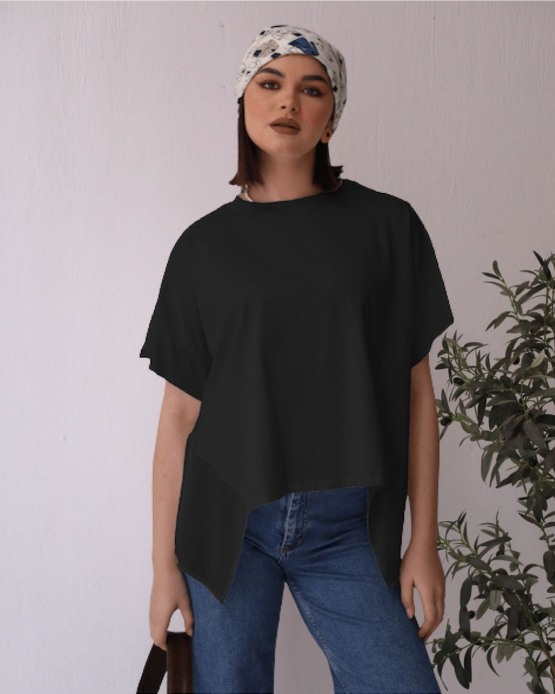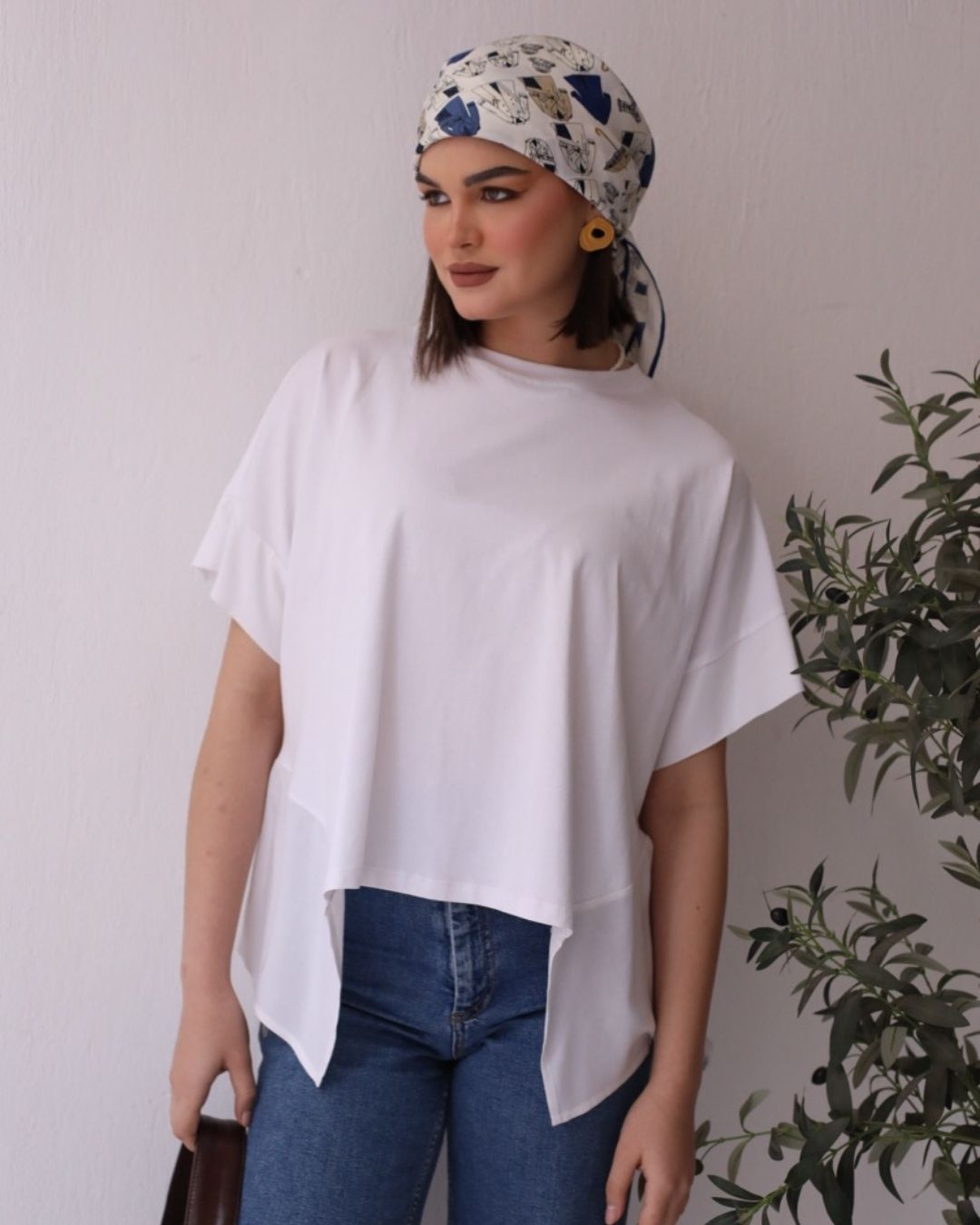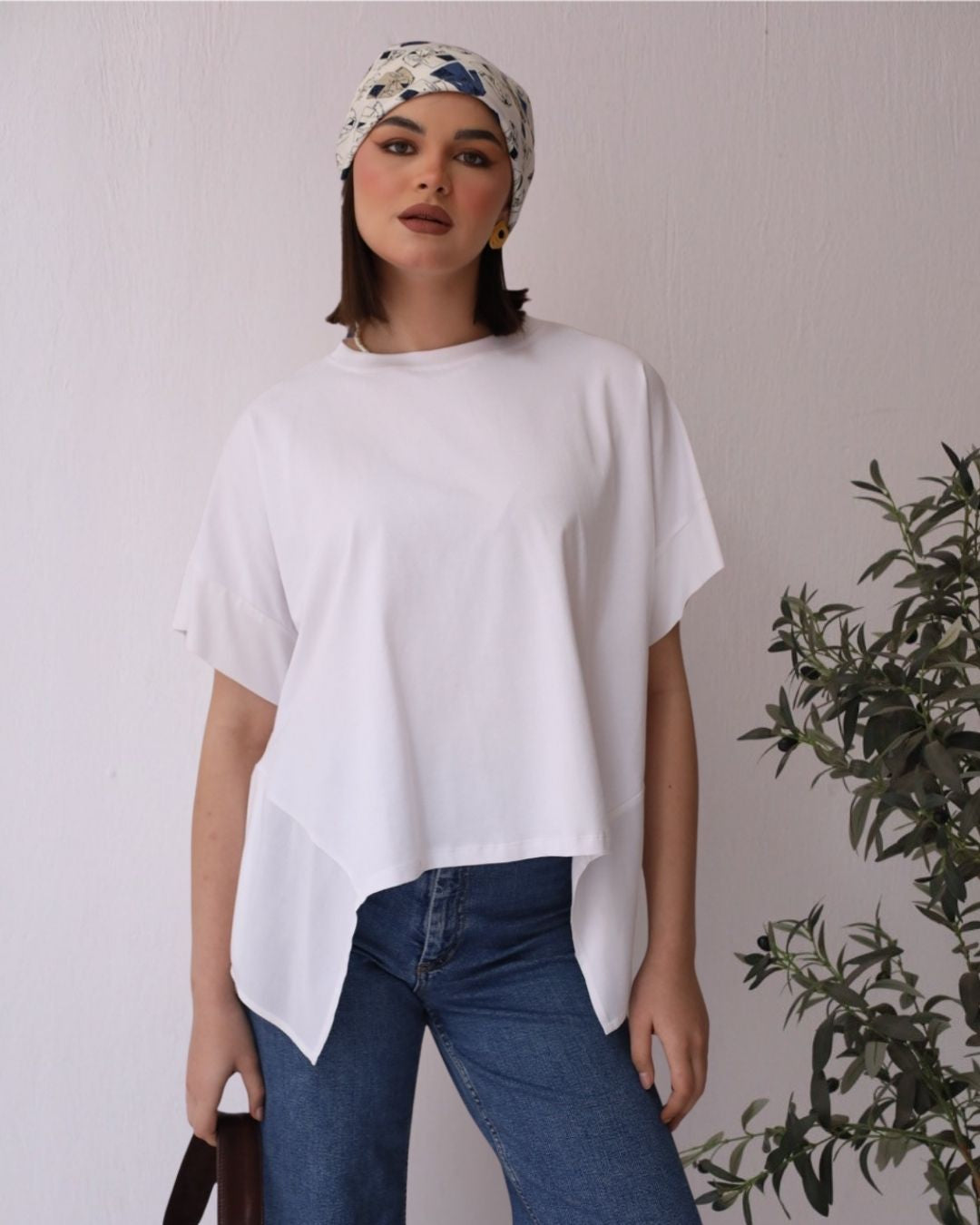 Short sleeved t-shirt with asymmetric shape on the sides. Available in white, black and beige.