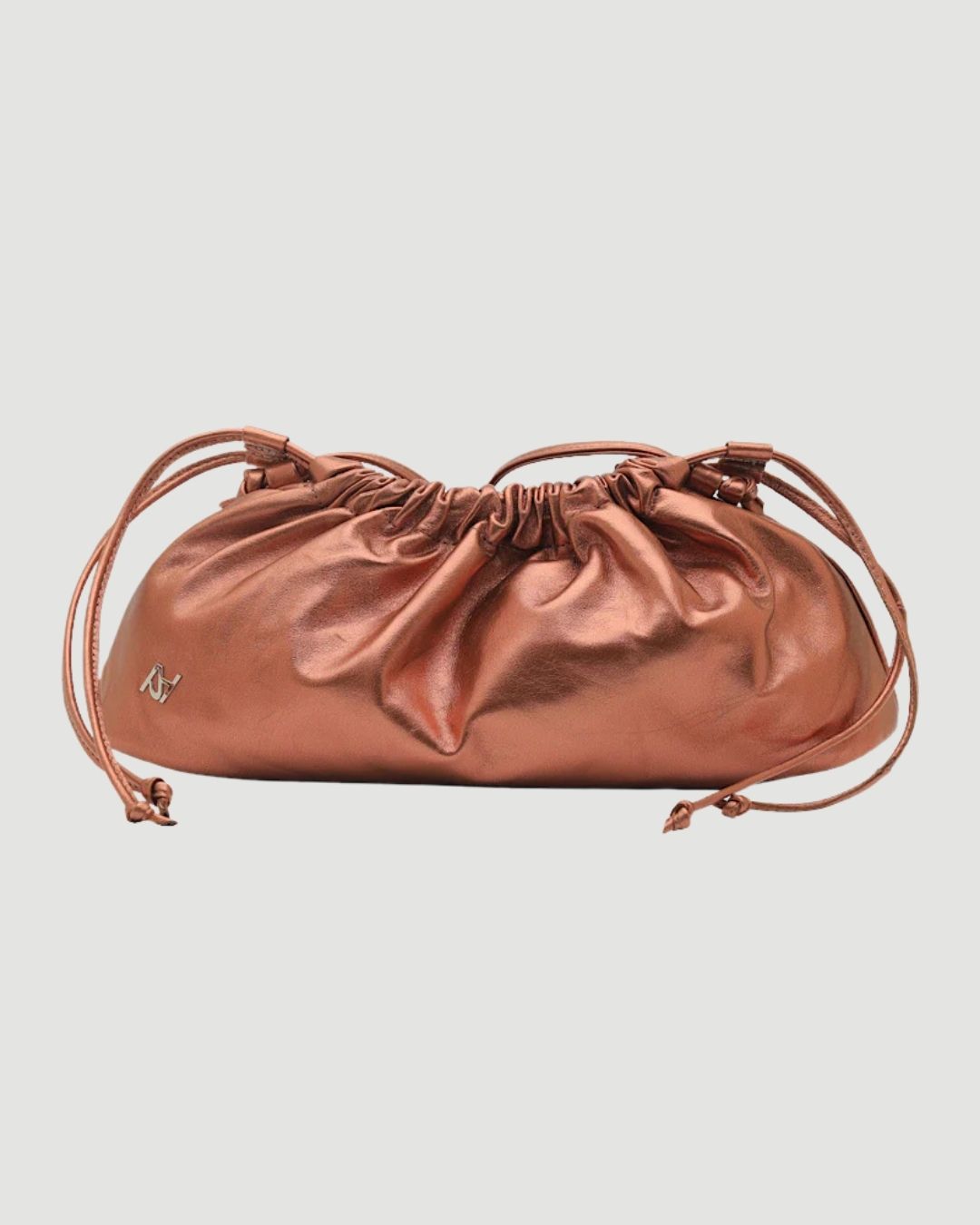 Leather pouch features a leather drawstrings and length adjustable shoulder strap. Available in washed silver, nude beige, burnt copper, electric blue, and washed red.