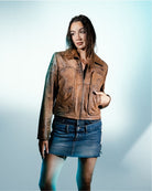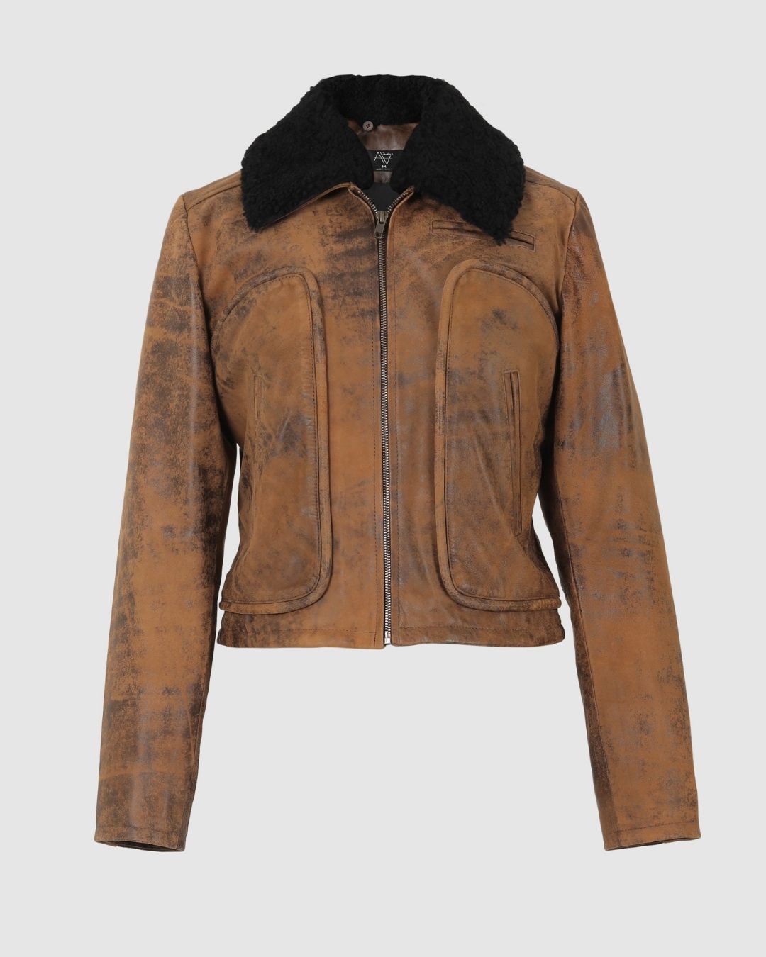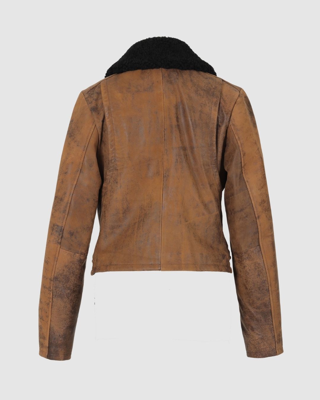 The Emery Leather jacket is made from distressed brown leather. It’s a relaxed fit jacket with removable shearling collar to serve your outfits from day to night. It features side front pockets and zip fastening at the front.