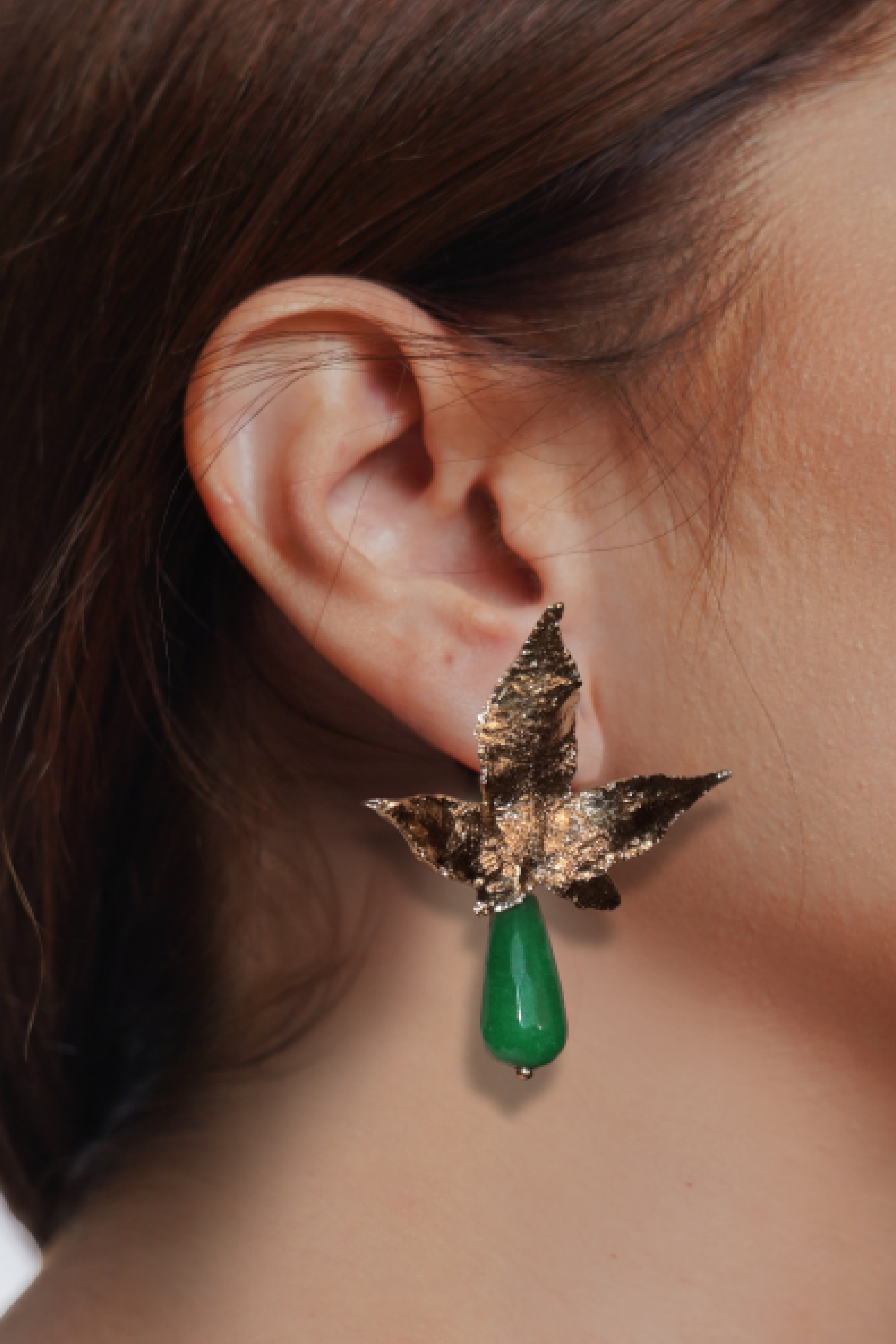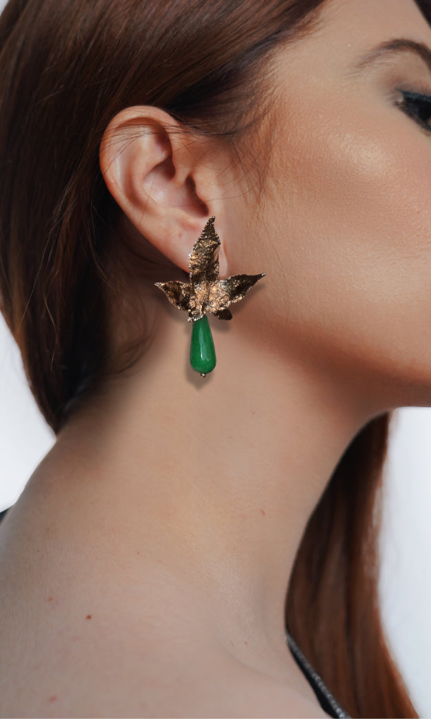 Inspired by the beauty of nature, these exquisite earrings feature a delicate, gold–toned leaf design with textured detailing, giving them a realistic, artisanal feel. The leaf is paired with rich, deep green teardrop stones that add a pop of color and elegance.